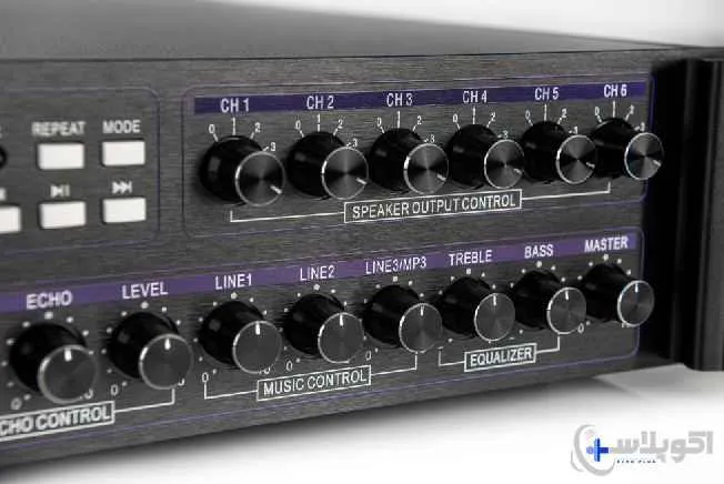 یکی از قابلیتهای حیاتی آمپلیفایر میکسر MA-660 P، سیستم مدیریت شش ناحیه (Zone) خروجی مجزا است. در پنل جلویی، شش ولوم SPEAKER OUTPUT CONTROL برای کانالهای CH 1 تا CH 6 وجود دارد که به شما این امکان را میدهد تا به صورت کاملاً مستقل، حجم صدای هر زون را تنظیم کنید. این ویژگی برای پروژههایی که نیاز به پیجینگ هدفمند و پخش موسیقی پسزمینه با سطوح صدای متفاوت دارند، ضروری است.